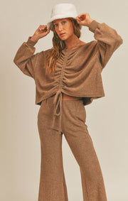 Our Change Like Weather Top is made of a heavy brushed jacquard melange rib, with mocha and white mixed yarn. The top is reversible and features and exploded seam and ruching detail.